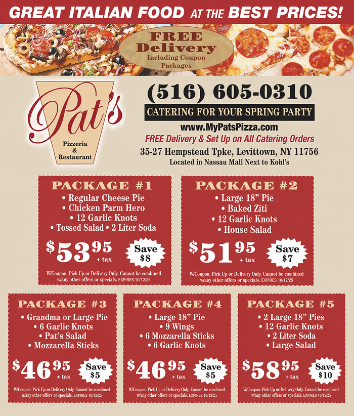 Enjoy delicious food at our Italian restaurant and Pizzeria in Levittown, New York. At Pat's Pizzeria & Restaurant, we offer authentic Italian cuisine in a friendly atmosphere. Stop by and grab a panini, a traditional pasta dish, or try something new from our authentic pizzeria like the healthy whole wheat pizza.